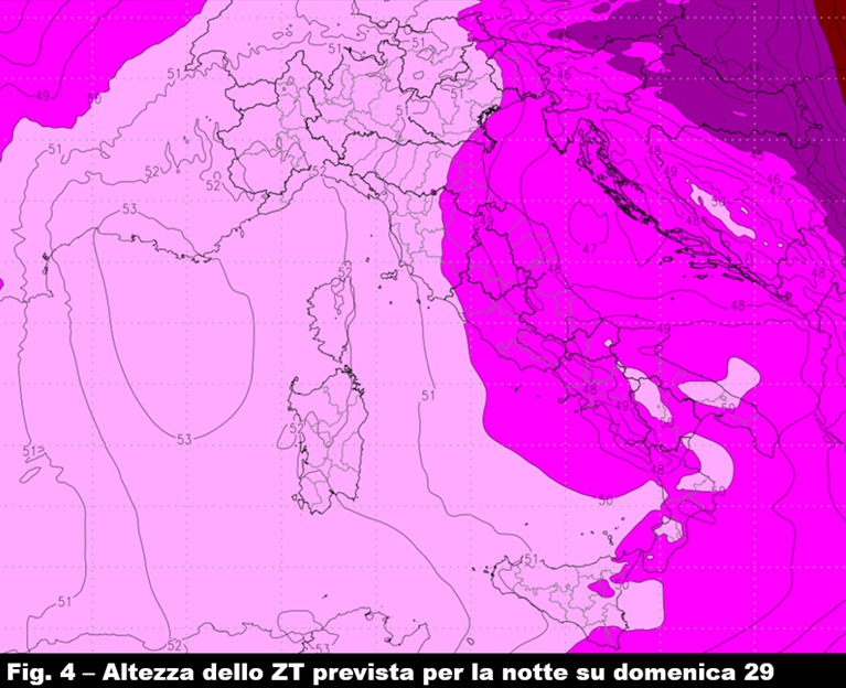 In definitiva, altezze di geopotenziale così eccezionalmente elevate indicano moti anticiclonici di subsidenza molto forti che schiacciano e comprimono verso il basso, riscaldandola, una massa d’aria che è già calda: un’altra grandezza atmosferica che darà dimostrazione del grado marcatamente anomalo della situazione meteorologica attesa sarà l’altezza dello zero termico, cioè la quota alla quale si registrano zero gradi (fig. 4): nella notte su domenica, questa quota sarà superiore ai 5000 metri.