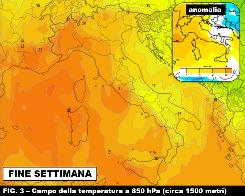 Si tratta della previsione di una situazione potenzialmente «estrema» per la configurazione barica attesa alle quote superiori perché altezze così elevate cadono, per questo periodo dell’anno, oltre il 99.5° percentile della climatologia di riferimento (fig. 1, a destra). Nei bassi strati, invece, si conferma la spinta da occidente dell’Anticiclone delle Azzorre che, posizionando i propri massimi di pressione a nord dell’arco alpino, inserirà l’Italia all’interno di un modesto pendio barico in grado da attivare una ventilazione prevalentemente nord orientale (fig. 2). I flussi, in discesa dalle Alpi e dagli Appennini, surriscalderanno ulteriormente per compressione una massa d’aria che sarà già calda in partenza perché legata all’espansione del promontorio nord africano: proprio tra il Nord Italia, il versante tirrenico e le due Isole Maggiori stazioneranno in quota, a circa 1500 metri, isoterme tra i 20 e i 22 °C e quindi di 5-6 °C oltre la media del periodo, mentre sul medio e basso versante adriatico un afflusso di aria meno calda farà diminuire di qualche grado le temperature (fig. 3).