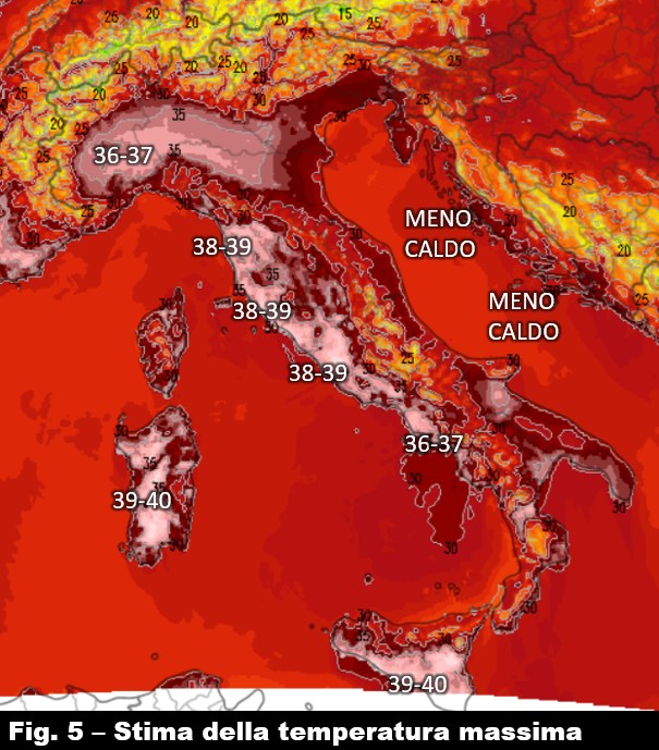 A tal proposito, tra sabato e domenica si prevedono temperature massime per lo più comprese tra 30 e 36 °C, leggermente più contenute lungo il versante adriatico. Picchi probabili tra i 38 e i 40 °C su Toscana, Lazio e Isole Maggiori (fig. 5). Con questa situazione, nei prossimi giorni proseguirà e si intensificherà ulteriormente anche l’onda di calore marina: a tal proposito, a fine mese aggiorneremo la situazione.