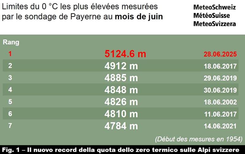Tutto il peso portato dal promontorio anticiclonico nord africano viene indicato, in queste ore, dall’altezza dello zero termico, cioè dalla quota a cui la temperatura raggiunge il valore di 0 °C. Emblematico, a tal proposito, il dato proveniente dal radiosondaggio effettuato da MeteoSvizzera presso la stazione meteorologica di Payerne (fig. 1): ieri, 28 giugno, l’isoterma di 0 °C ha raggiunto la quota più elevata della serie storica – che inizia nel 1954 – assestandosi a circa 5125 metri e superando così, per la prima volta in giugno, proprio l’altezza dei cinque chilometri.