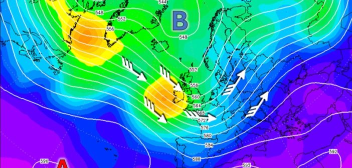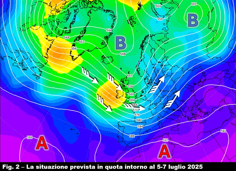 Per osservare un cambiamento, potenzialmente più strutturato, bisognerà probabilmente aspettare intorno al prossimo fine settimana, quando in chiave probabilistica la modellistica numerica inquadrerebbe l’ingresso di un cavo d’onda sull’Europa occidentale che convoglierebbe verso la nostra penisola aria di origine atlantica a rotazione ciclonica, proveniente da nord-ovest (fig. 2). La dinamica del sistema dovrà essere ancora inquadrata nei dettagli nei prossimi giorni, alla luce dei nuovi aggiornamenti che saranno più affidabili: per il momento prendiamo solo atto che esiste un segnale nella futura dinamica atmosferica che andrà per lo meno ad attenuare l’intensa e persistente fase calda in atto e che, come ormai l’esperienza insegna, in questo tipo di evoluzioni farebbe aumentare la probabilità di avere forti contrasti termici.