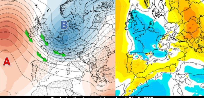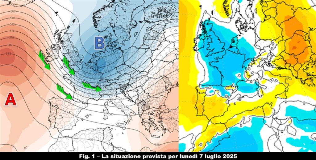 Ancora qualche giorno in compagnia del caldo anche intenso e del promontorio nord africano, responsabile di questa situazione meteorologica. A partire da domenica, però, una ridistribuzione delle figure bariche a scala europea inizierà a porre fine a queste condizioni atmosferiche partendo dalle regioni settentrionali. Come spesso accade in questo tipo di evoluzioni, sarà l’Anticiclone delle Azzorre ad avere un ruolo chiave in questa dinamica perché, elevandosi in Oceano Atlantico, stimolerà la formazione di una saccatura che entro lunedì si allungherà dal Mare del Nord all’Europa centrale per poi estendere la propria influenza anche al Mediterraneo centrale (fig. 1, a sinistra).