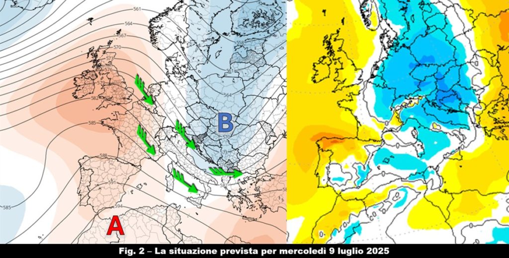 Entro mercoledì 9 luglio, tutta la penisola sarà così attraversata in quota da intense correnti nord-occidentali che completeranno l’ingresso della nuova massa d’aria estendendo la diminuzione della temperatura anche alle regioni meridionali (fig. 2, a destra).