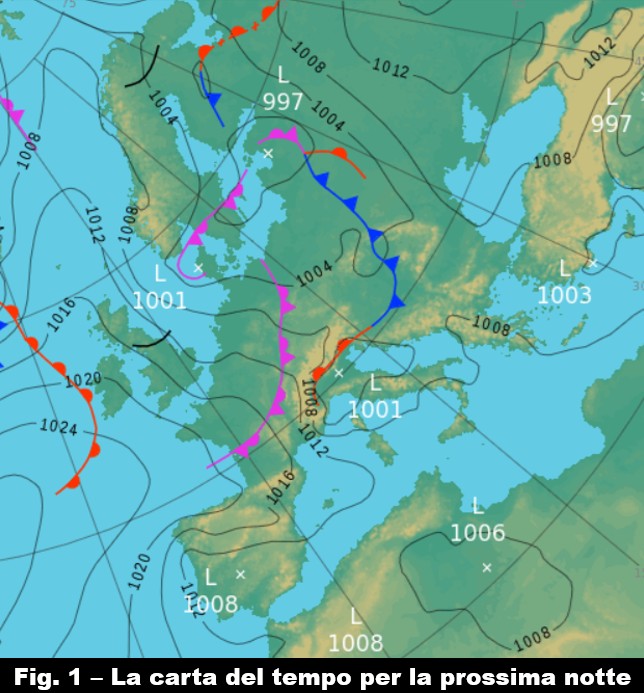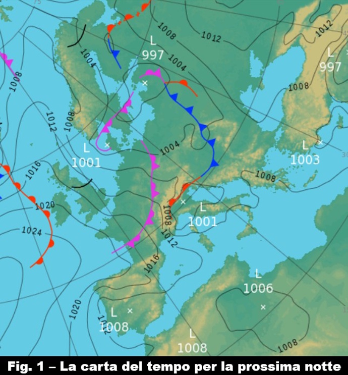 Sarà proprio questo passaggio instabile ad aprire definitivamente le porte a un ingresso più deciso dell’aria relativamente più fresca che già oggi ha iniziato ad affluire dal Golfo del Leone ma che nelle prossime ore valicherà anche l’arco alpino per essere sospinta entro mercoledì da venti tesi o moderati di maestrale e di bora su tutta la penisola. Efficace, nell’agevolare parte del risucchio della nuova massa d’aria, sarà la depressione che si è formata oggi sul Golfo Ligure e che nella prossima notte ritroveremo, con un minimo di circa 1000 hPa, sul Nord-Est (fig. 1): si tratta di una depressione piuttosto profonda per svilupparsi ormai nel cuore dell’estate, ma evolverà velocemente verso nord-est seguita da un moderato incremento della pressione atmosferica che garantirà quel gradiente barico utile a mantenere attiva la ventilazione settentrionale almeno per le prossime 48-72 ore.