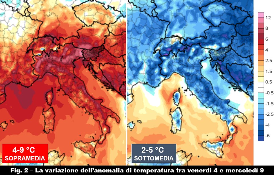 Gli effetti delle nuove correnti sul campo termico saranno evidenti, specie se confrontiamo l’intensità dell’anomalia della temperatura che abbiamo avuto fino a venerdì 4 (fig. 2, a sinistra) con lo scarto dalla media previsto per mercoledì 9 (fig. 2, a destra): passeremo approssimativamente da valori di 4-9 °C sopra la media a 2-5 °C sotto la media nel giorno del massimo rinfrescamento. Poi, da giovedì 10, seppur in maniera contenuta i termometri inizieranno a riguadagnare qualche grado per raggiungere valori tutto sommato normali per il periodo almeno fino a sabato.