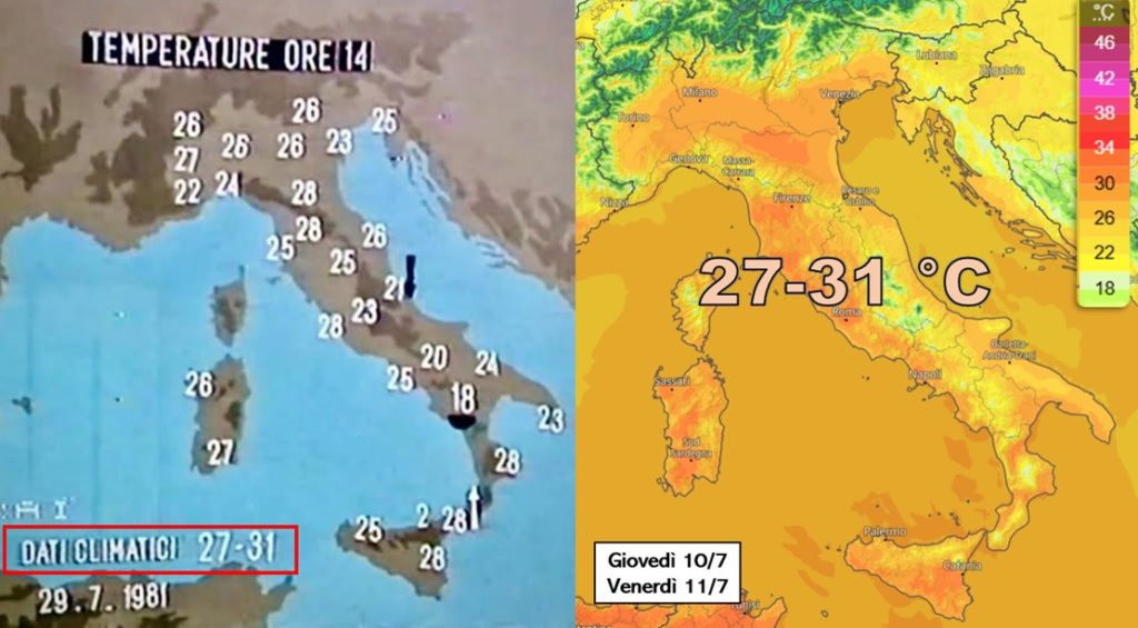 Il valore scientifico di quel fotogramma è invece tutto concentrato in quella scritta riportata in basso a sinistra, in cui leggiamo che i dati climatici di riferimento – cioè le temperature medie del periodo di allora – erano compresi tra 27 e 31 °C. Perché desidero che si focalizzi l’attenzione proprio su questa forbice termica? Semplicemente perché in questo intervallo cadranno, molto probabilmente, anche le temperature massime che registreremo nella seconda parte della settimana e in particolar modo tra giovedì 10 e venerdì 11 luglio. In altre parole, vivremo alcune giornate in cui il caldo sarà gradevole, non eccessivo e sarà simile a quello che una quarantina di anni fa era la norma.