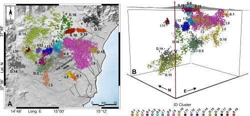 Fig.1 – Distribuzione spaziale dei cluster sismici identificati tramite analisi avanzata: (A) rappresentazione su mappa con localizzazione degli eventi e (B) visualizzazione tridimensionale che ne evidenzia la profondità e la disposizione relativa.