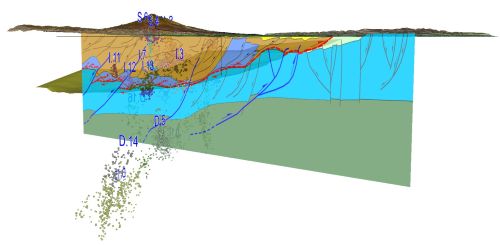 Fig.2 – Modello sismo-tettonico 3D con vista orientata verso nord-est, che mette in risalto la correlazione tra i cluster sismici e le principali strutture geologiche dell’area di studio