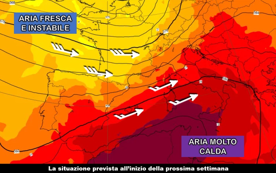 Si va quindi delineando uno scenario meteorologico che porrà, agli antipodi, due tipi di masse d’aria dalle caratteristiche termodinamiche molto diverse: se da un lato quella molto calda di origine sahariana giungerà sulla verticale del Sud e di parte del Centro con isoterme a 850 hPa comprese tra 24 e 29 °C, a cavallo dell’arco alpino i valori saranno anche di circa 10-13 °C inferiori. Non sarà quindi solo il gran caldo il protagonista indiscusso, ma in una situazione in cui entrerà in scena la curvatura di una saccatura bisognerà analizzare anche se si concretizzerà la formazione di fenomeni intensi su parte del Nord a seguito di questo contrasto termico. Avremo modo di definire meglio la previsione degli eventuali fenomeni e delle temperature massime nei prossimi giorni.