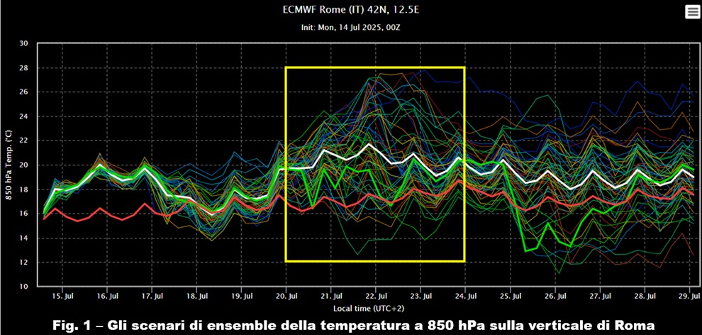 Dopo aver inquadrato l’evoluzione più probabile che si delineerà nel corso dei prossimi giorni – e che trova conferma anche negli ultimi ricalcoli della modellistica numerica – proviamo oggi a compiere un passo avanti e vedere se è possibile fornire le prime indicazioni di massima su quello che potrebbe essere il segnale che guiderà la circolazione atmosferica all’inizio della prossima settimana. Abbiamo indicato, per tale periodo, un nuovo aumento delle temperature affermando che avrebbe potuto comportare l’inizio di una nuova ondata di calore: cerchiamo allora di dare delle ulteriori indicazioni a riguardo. Iniziamo come sempre dal grado di attendibilità della previsione dando uno sguardo agli scenari di ensemble della temperatura a 850 hPa, cioè a circa 1500 metri di quota, calcolati sulla verticale di Roma che, come sempre, prendiamo come rappresentativa della dinamica atmosferica sul Mediterraneo centrale.
