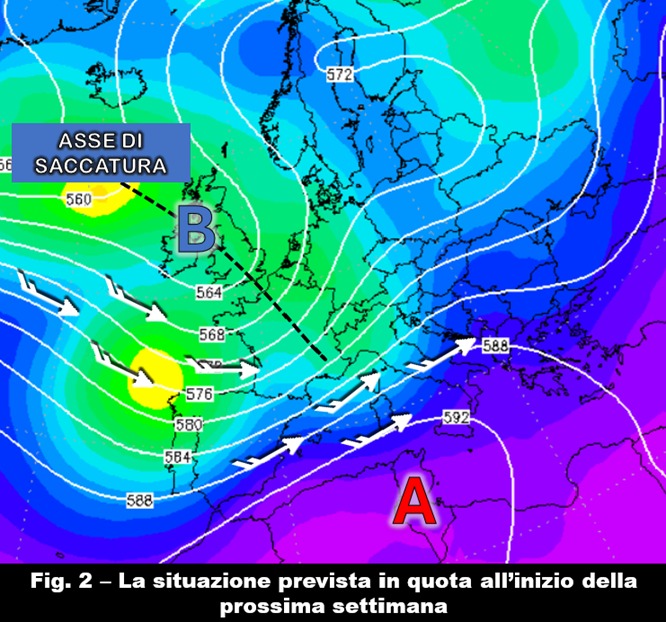 Al contrario, saremo di fronte all’interazione tra una saccatura in probabile ingresso sull’Europa centro-occidentale che solleciterà il rigonfiamento del campo anticiclonico subtropicale, esponendolo tuttavia all’azione di piallatura da parte delle correnti perturbate che si inseriranno all’interno della circolazione ciclonica stessa (fig. 2): in effetti, un’asse di saccatura così disposto non è un grande alleato del promontorio perché non ne fa una figura particolarmente stabile nella sua posizione. L’incertezza sul campo termico, di cui abbiamo appena parlato, nasce proprio da questa situazione sinottica. E non poteva essere altrimenti, dal momento che la modellistica si trova ancora nella fase di definire quanto potrebbe essere incisiva, e con quale angolazione, la saccatura attesa sui settori occidentali europei.