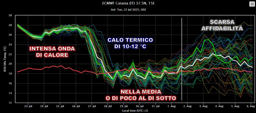 Scegliamo questo grafico delle previsioni di ensemble della temperatura a 850 hPa, cioè a circa 1500 metri, valide sulla verticale di Catania, perché dall’andamento di tutti gli scenari calcolati è ben evidente quando si completerà l’avvicendamento tra la massa d’aria molto calda di origine subtropicale continentale e quella relativamente più fresca di origine atlantica anche su una delle ultime regioni che usciranno da questa fase meteorologica dominata dall’influenza del promontorio nord africano. È infatti ormai molto probabile che sulla Sicilia orientale, alla quota indicata, si passi da temperature di 26-27 °C a 16-17 °C nel corso di domenica: si tratterrà di un calo sensibile perché su questa regione, così come sulla buona parte del Sud, si partirà da valori ben al di sopra delle medie trentennali di riferimento. Entro domenica, tutta la penisola sperimenterà un campo termico che si sarà riportato su valori tipici di fine luglio o di poco al di sotto garantendo così condizioni ambientali più vivibili, non solo per le temperature ma anche per i tassi di umidità. Se per noi questa dinamica atmosferica significherà semplicemente la fine di un’ondata di calore, per il clima significherà invece archiviare una fase di caldo anomalo – perché non ci sono altri termini per etichettare uno scarto positivo di 8-10 °C – che avrà praticamente la certezza di non essere bilanciato da una fase di «freddo anomalo» della stessa portata. Già, perché affinché non rimanga traccia alcuna di un segnale così forte sarebbe necessario un periodo della stessa durata con temperature inferiori alla media di una decina di gradi: in pratica, in questo caso parliamo di un’isoterma di 6-8 °C al posto di una 18 °C. Parliamo ormai di scenari che non fanno più parte del nostro tempo e che sono diventati sempre più rari, fin quasi a scomparire del tutto. Le fasi così calde, o quantomeno molto calde che durano anche per intere settimane o decadi, si susseguono invece più frequentemente e non bisogna aspettare chissà quanto tempo per sperimentarne di nuove in ogni stagione dell’anno. Per le ondate di freddo questo non succede perché sono semplicemente diventate latitanti. Le irruzioni che in estate definiamo «fresche» hanno spesso il compito di riportare le temperature nella media o di poco al di sotto di essa per tempi decisamente inferiori rispetto a quelli che caratterizzano le fasi calde. Sarebbe un po’ come riempire un sacco di sabbia con una pala e poi provare a svuotarlo con un cucchiaino, avendo molto meno tempo a disposizione rispetto ai tempi in cui usiamo la pala: come il sacco di sabbia non potrà mai svuotarsi, allo stesso modo il bilancio termico mensile resterà condizionato dal segno positivo perché i contributi delle fasi calde funzionano, in pratica, come quando usiamo la pala per riempire il sacco.
