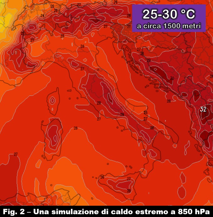 Non ci sono però solo gli scenari estremi che sono ipotizzati per il futuro e che poi, in realtà, anticipano abbondantemente i tempi. Anche chi analizza i prodotti della modellistica numerica, per estrarre da essi le informazioni che devono essere comunicate al grande pubblico mediante un bollettino meteorologico, si confronta abbastanza spesso nel periodo estivo con ipotesi che lasciano davvero riflettere su quanto un risultato, proveniente dalla risoluzione di un set di equazioni, possa suggerire per esempio valori di temperatura che vanno oltre l’immaginazione. Sì, perché avere per esempio temperature a 850 hPa comprese tra 25 e 30 °C, come per esempio è capitato di osservare in una delle recenti simulazioni modellistiche (fig. 2), lascia davvero increduli e senza parole. Semplicemente, basiti.