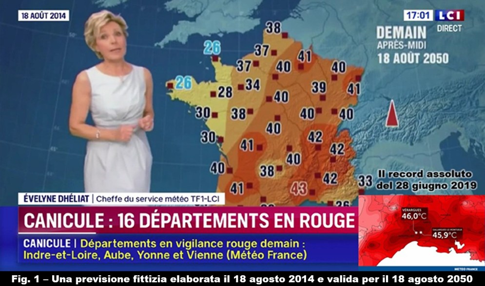 Nel 2014, la meteorologa francese Evelyne Dhéliat presentò un bollettino meteorologico fittizio basato sulle proiezioni climatiche elaborate da Météo-France e valide per agosto 2050. Le temperature massime previste per quel fatidico mese scossero – e non poco – l’opinione pubblica che rimase incredula di fronte a una mappa in cui la soglia dei 40 °C veniva raggiunta e superata in modo diffuso in tutto il Paese, da nord a sud (fig. 1).