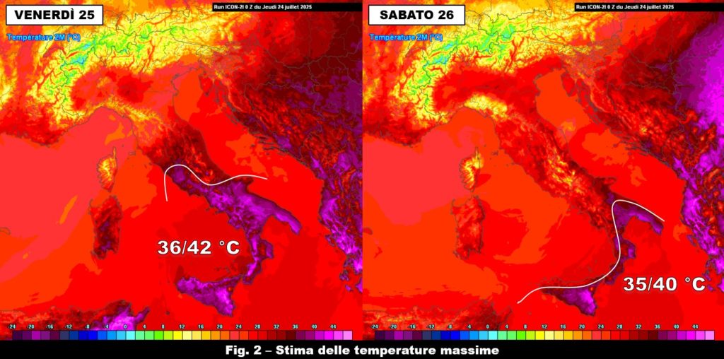 Nella giornata di venerdì 25, il caldo subirà quindi un’ultima impennata che in quota si manifesterà con isoterme a 850 hPa per lo più comprese tra 24 e 28 °C su tutte le regioni del Sud. Di pari passo, in prossimità del suolo le temperature massime si porteranno diffusamente su valori elevati o molto elevati in particolar modo sulle aree interne dove l’intervallo termico più probabile sarà compreso tra 36 e 42 °C, con qualche picco superiore non escluso (fig. 2, a sinistra). Si prevede caldo moderato anche sulle regioni centrali – ad eccezione della Toscana – e sulle aree interne centro-meridionali della Sardegna con picchi fino a 35-36 °C, mentre al Nord non si salirà oltre i 27-28 °C.