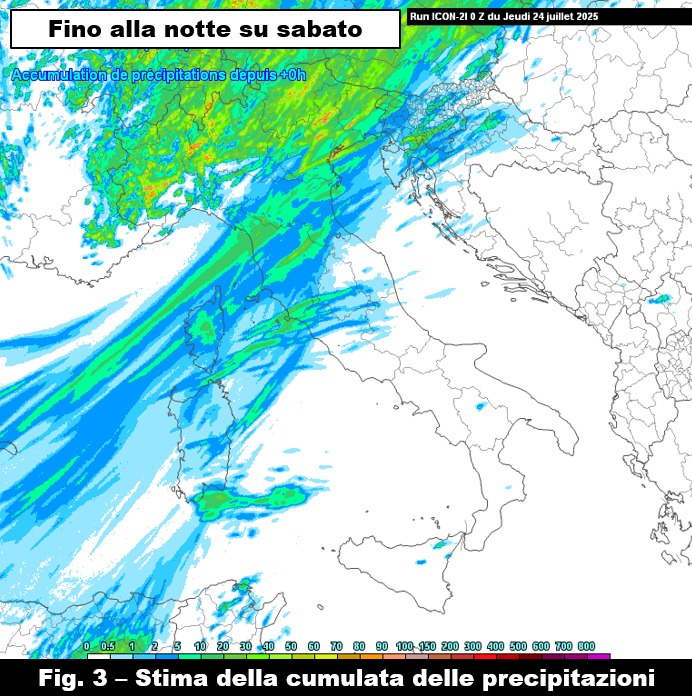 Sabato 26, il gran caldo inizierà a ritirarsi e interesserà solo le estreme regioni meridionali, dove sarà ancora probabile raggiungere e localmente superare i 40 °C (fig. 2, a destra). Per quanto riguarda lo stato del tempo, l’evoluzione piuttosto lenta della saccatura verso levante andrà gradualmente a coinvolgere, con il proprio ramo ascendente, le regioni settentrionali e quelle centrali entro la giornata di domani, venerdì. Condizioni di instabilità determineranno così rovesci e temporali sparsi soprattutto al Nord e in forma più irregolare tra Toscana, Umbria, Marche, Lazio e Sardegna dove sarà più probabile solo il passaggio di qualche piovasco. Completeremo la previsione per il fine settimana nel prossimo intervento.