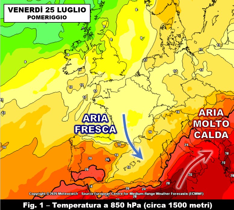 La saccatura nord atlantica ormai in procinto di entrare sul Mediterraneo occidentale sta riorganizzando i flussi alle nostre latitudini e arriverà, entro le prossime 24 ore, a porre a stretto contatto due masse d’aria dalle caratteristiche termodinamiche molto diverse: una relativamente fresca di origine polare marittima che entrerà dal Golfo del Leone per raggiungere le Isole Baleari e una molto calda, di origine subtropicale continentale, in movimento verso le nostre regioni meridionali e parte di quelle centrali (fig. 1). Con questa evoluzione osserveremo così l’ultimo sussulto del promontorio nord africano che nel fine settimana lascerà gradualmente il palcoscenico del Centro-Sud per permettere il cambiamento di circolazione e la fine dell’intensa onda di calore.