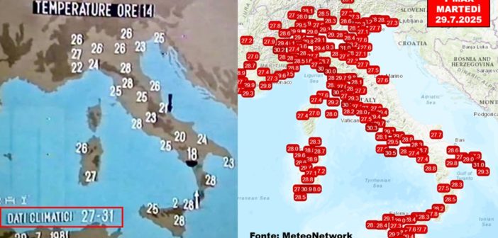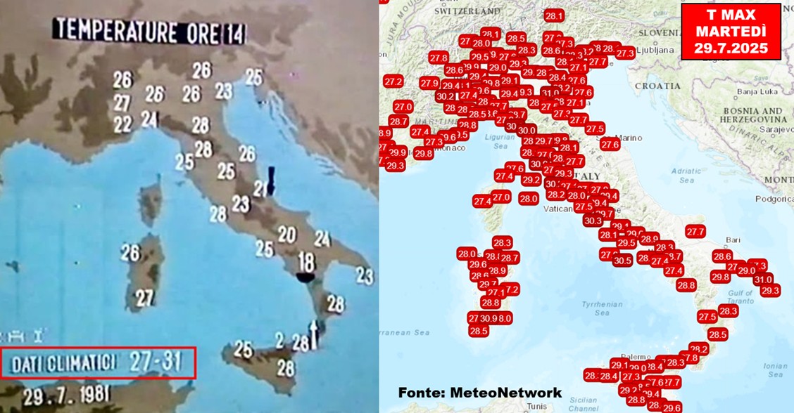.La ricordate la figura a sinistra? Ne abbiamo parlato qualche settimana fa quando, di questa mappa, se ne era fatto un uso non propriamente corretto e avevamo sottolineato che la sua importanza era semmai legata ai valori climatologici di riferimento, compresi tra 27 e 31 °C. Era il 29 luglio del 1981 quando il Generale Andrea Baroni raccontava le condizioni meteorologiche di quel giorno: erano, esattamente, 44 anni fa. Immaginiamo allora di salire sulla macchina del tempo e di tornare proprio a quel 1981, portando con noi le temperature massime registrate il 29 luglio 2025.