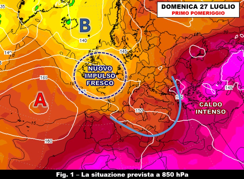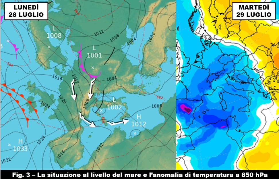 Domenica, invece, ci aspettiamo un parziale miglioramento delle condizioni meteorologiche, con un tipo di tempo governato prevalentemente dalla variabilità che potrebbe dar luogo ancora a qualche isolato piovasco. Da lunedì 28, dovremo invece seguire l’evoluzione del nuovo impulso di aria fresca che, interagendo con il baluardo alpino, darà luogo alla formazione di una depressione sottovento tra il Golfo Ligure e il Tirreno settentrionale (fig. 3, a sinistra): per prevedere una più realistica distribuzione dei fenomeni bisogna però aspettare ancora qualche aggiornamento perché sussistono ancora incertezze sulla sua traiettoria dal momento che alcuni scenari optano per uno scorrimento della figura di bassa pressione anche lungo il versante tirrenico, altri invece per un suo allontanamento verso il settore adriatico. Al di là di queste differenze, che devono essere risolte per definire meglio i particolari della previsione su scala regionale, nelle linee generali possiamo dire a questa dinamica saranno associati una netta intensificazione delle condizioni di instabilità e un nuovo calo termico che ci farà entrare in un periodo più fresco del normale. Questa nuova fase è destinata probabilmente a durare, seppur smorzandosi gradualmente, almeno fino ai primi giorni di agosto.