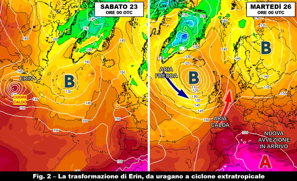 Nella prossima settimana saranno sostanzialmente due le conseguenze di questa dinamica sul bacino del Mediterraneo occidentale: la prima sarà quella di innescare, tra mercoledì 27 e venerdì 29 agosto, una nuova avvezione di aria calda subtropicale soprattutto verso le nostre regioni centro-meridionali che risentiranno di un sensibile aumento delle temperature; la seconda sarà quella di pilotare la perturbazione associata alla vasta figura ciclonica anche verso l’Italia man mano che la depressione si muoverà verso levante ed estenderà la ragnatela di isobare anche verso le nostre latitudini. Non c’è nulla di straordinario in tutto questo. Erin non raggiungerà l’Europa se non come una comune depressione certamente intensa, ma simile a tutte le altre depressioni che attraversano il nostro continente esponendolo anche a condizioni di marcato maltempo con venti forti e piogge anche battenti: non è la prima volta e non sarà nemmeno l’ultima.