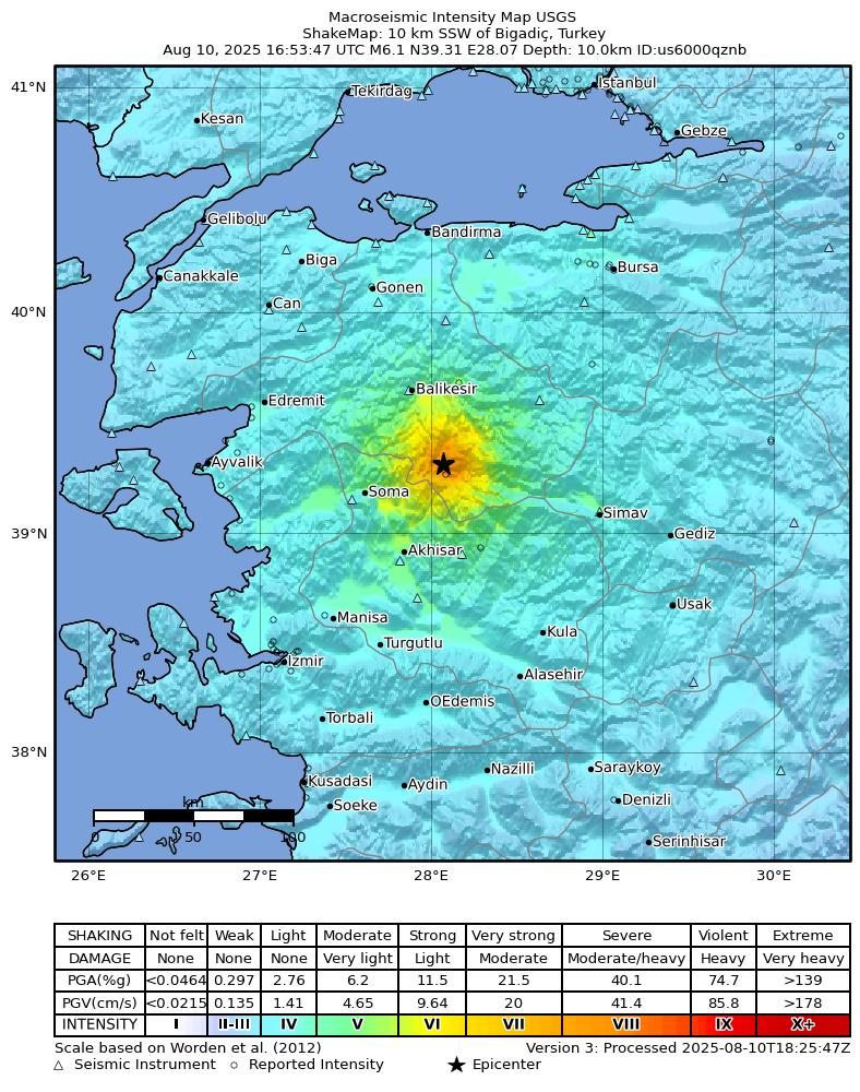 FORTE SCOSSA DI TERREMOTO DI Mwp 6.2 NELLA ZONA DI BIGADIC IN TURCHIA
