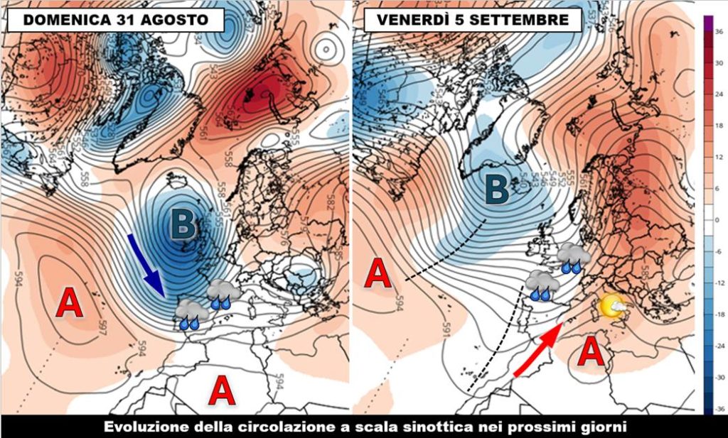 Il passaggio di consegne tra l’estate meteorologica e l’autunno meteorologico è ormai prossimo ed avverrà all’insegna di alcuni impulsi instabili che, grazie ad una circolazione ciclonica che è riuscita ad approfondirsi negli ultimi giorni con il contributo dell’ex uragano Erin, hanno ricevuto la spinta necessaria per entrare sul bacino occidentale del Mediterraneo e interessare così anche la nostra penisola. Entro la giornata odierna si completerà la prima fase legata a questa dinamica. Dopo una temporanea pausa che interverrà nella giornata di domani, domenica 31 agosto, una seconda fase instabile abbastanza simile si ripresenterà da ovest e seguirà all’incirca lo stesso copione della precedente, sotto la guida della profonda figura di bassa pressione che continuerà a ruotare su tutta l’Europa occidentale mantenendo il proprio centro motore in prossimità dell’Irlanda (figura a sinistra).