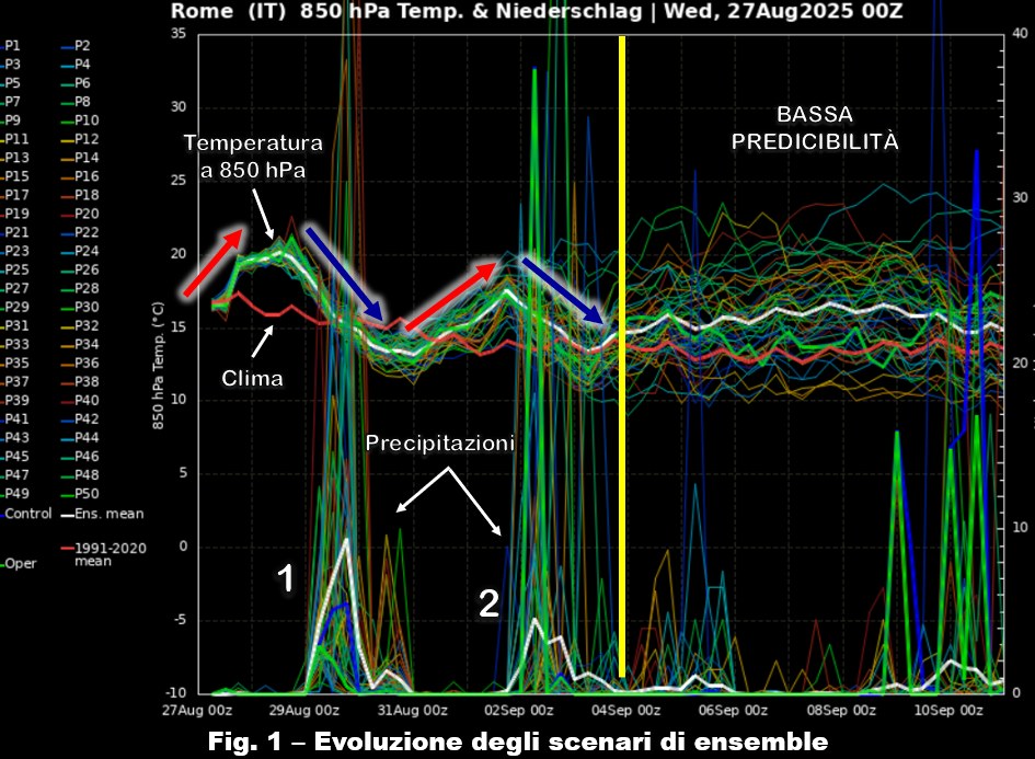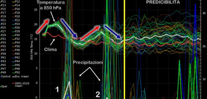 Riprendiamo a parlare delle condizioni meteorologiche a medio e lungo termine avvalendoci come sempre degli scenari di ensemble calcolati sulla verticale di Roma che prendiamo come esempio rappresentativo per osservare quale potrebbe essere il segnale che governerà il tempo alle nostre latitudini nei prossimi giorni (fig. 1). Cominciando l’analisi dal campo termico a 850 hPa, cioè a circa 1500 metri di quota, nei prossimi 7-8 giorni risulta ben definito l’andamento oscillante della temperatura che sarà legato a un susseguirsi di avvezioni di aria calda e di aria più fresca, indicate rispettivamente dalle frecce rosse e blu: è questo il classico comportamento che si può osservare quando la dinamica atmosferica risulta piuttosto vivace e, nella fattispecie, è governata dalle correnti ondulate provenienti da ovest che, come è noto, guidano verso il nostro continente le perturbazioni atlantiche.