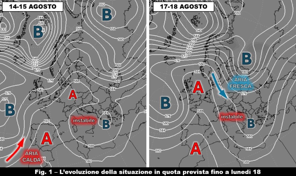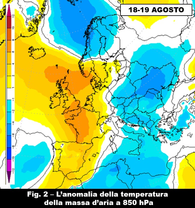 Tra il fine settimana e martedì, invece, una modifica della struttura del promontorio subtropicale sarà sufficiente a far affluire verso l’Italia aria relativamente più fresca. La cresta dell’ondulazione, che dà la forma proprio alla struttura anticiclonica in quota, si allungherà verso il Mare del Nord liberando così l’Europa centrale e aprendo da qui un canale che farà giungere fin sull’Italia correnti settentrionali (fig. 1, a destra). Non ci troveremo quindi più in un contesto atmosferico a tratti instabile all’interno di una circolazione chiusa di aria calda, ma in una situazione sempre instabile guidata dall’ingresso di una nuova massa d’aria, proveniente dalle alte latitudini, che causerà anche una graduale diminuzione delle temperature. Non aspettiamoci raffreddamenti significativi perché, con buona probabilità, non andremo oltre un riallineamento dei valori alle medie climatiche del periodo: a circa 1500 metri, infatti, tra lunedì 18 e martedì 19 agosto l’anomalia della temperatura della massa d’aria oscillerà per lo più tra +2 °C e -2 °C, partendo dalla situazione attuale in cui, sempre a 1500 metri, lo scarto dal clima oscilla tra +1/+3 °C delle regioni meridionali e i +5/+6 °C di quelle settentrionali.