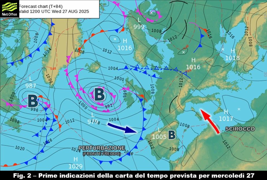 Sarà proprio questa evoluzione a introdurre il peggioramento del tempo che si profilerebbe anche per la nostra penisola a partire dai giorni centrali della settimana entrante, perché il calo della pressione sull’Europa occidentale spianerà la strada a una perturbazione che poi riuscirà a entrare sul settore occidentale del nostro bacino con la complicità di una depressione secondaria, in formazione nei dintorni dell’arcipelago delle Baleari, che prenderà in carico il sistema nuvoloso per guidarlo verso levante (fig. 2).