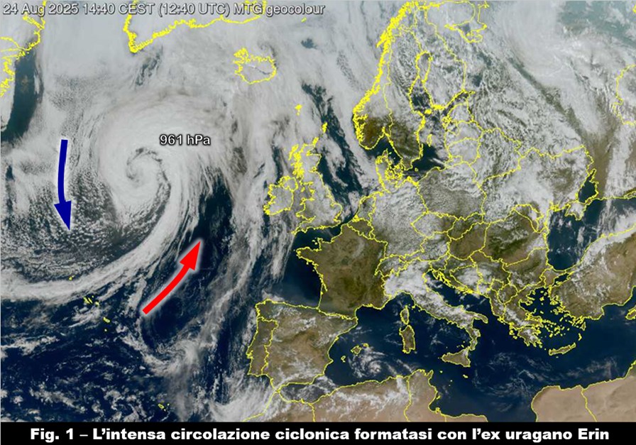 L’uragano Erin è stato fagocitato dalla depressione d’Islanda, ma i due sono anche scesi a compromessi. Se da un lato il ciclone ha abbandonato la propria indole tropicale, dall’altro ha contribuito a intensificare la circolazione ciclonica facendola ora ruotare attorno a un minimo che ha perso 12 hPa nelle ultime 12 ore, raggiungendo così nel proprio centro l’attuale pressione atmosferica di 961 hPa (fig. 1). È proprio a questo vortice, diventato ora extratropicale, che dobbiamo guardare nei prossimi giorni perché avrà in mano le redini del tempo dell’Europa atlantica e nella seconda parte della settimana anche del Mediterraneo occidentale.La depressione farà qualche passo verso il nostro continente ma rimarrà ancora chiusa su se stessa fino a martedì 26, avvolta in una fitta ragnatela di isobare che allenteranno la morsa solo tra mercoledì 27 e giovedì 28 quando il sistema ciclonico raggiungerà le Isole Britanniche e tenderà ad assumere, con buona probabilità, una forma ellissoidale allungata verso il Golfo di Biscaglia.