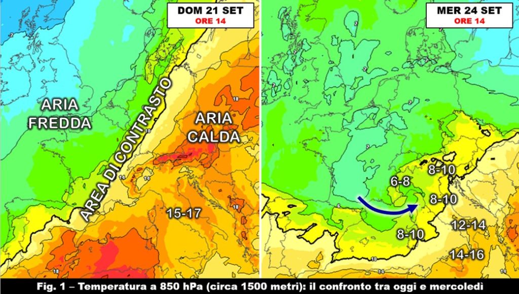 Quella di oggi sarà l’ultima giornata all’insegna di temperature massime prettamente estive da Nord a Sud grazie alla presenza in quota, a 850 hPa, di una massa d’aria di origine subtropicale che presenterà isoterme di circa 15/17 °C dalle Alpi alla Sicilia. Il cambiamento di circolazione è però dietro l’angolo perché sulla vicina Francia si sta ammassando l’aria più fredda in movimento in seno alla saccatura che sta interessando l’Europa occidentale e che fa giungere sulle Isole Britanniche la parte periferica di un flusso artico-marittimo con temperature fino a 0/-2 °C alla stessa quota isobarica (fig. 1, a sinistra).