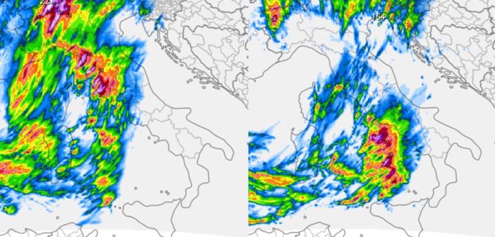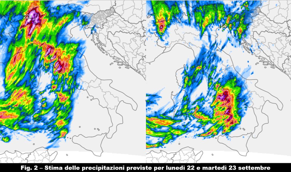 Il contrasto con l’aria più calda preesistente avrà modo di materializzarsi ancora in strutture temporalesche anche intense che potrebbero interessare il versante ligure-toscano mentre piogge copiose e persistenti, sostenute dallo sbarramento orografico, andranno a impegnare i settori montani e pedemontani tra la Valle d’Aosta e la Lombardia occidentale, dove si potrebbero registrare cumulate anche superiori ai 150-200 millimetri entro la fine del giorno. Martedì 23 il sistema frontale farà un altro passo avanti, insistendo ancora sul Nord-Est e continuando la corsa verso il medio-basso Tirreno, dove andrà probabilmente a concentrarsi la fenomenologia più organizzata e intensa che potrebbe approcciare la Campania e la Sicilia occidentale (fig. 2, a destra): a tal proposito, ci sono ancora delle incertezze sulla distribuzione della fenomenologia che si evidenziano nelle differenze nelle simulazioni modellistiche, ancora non concordi su quanto le precipitazioni più intense riescano a raggiungere le coste e l’entroterra: per una maggiore affidabilità previsionale bisognerà quindi aspettare i nuovi ricalcoli. Nel corso del giorno, la parte più intensa dell’irruzione di aria fredda inizierà comunque a entrare dal Golfo del Leone e a presentarsi sui mari di ponente sotto forma di venti di libeccio: sarà questo il saluto della nuova stagione autunnale dal punto di vista termico.