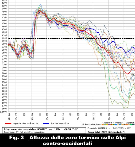 La portata dell’evento diventa tangibile anche nella previsione dell’altezza dello zero termico che, come sempre, fornisce indicazioni indirette sull’intensità dell’avvezione subtropicale in scorrimento in quota. Davvero significativo, a tal proposito, osservare che sulle Alpi centro-occidentali si assisterà, tra mercoledì 17 e giovedì 18, a un repentino aumento di questa altezza tale da portare l’isoterma di 0 °C a raggiungere probabilmente i 4700-4900 metri (fig. 3): la pesante anomalia su tutta la cerchia alpina dovrebbe durare fino a domenica, quando lo zero termico dovrebbe scendere sotto i 4000 metri e abbassarsi ulteriormente nei giorni successivi.