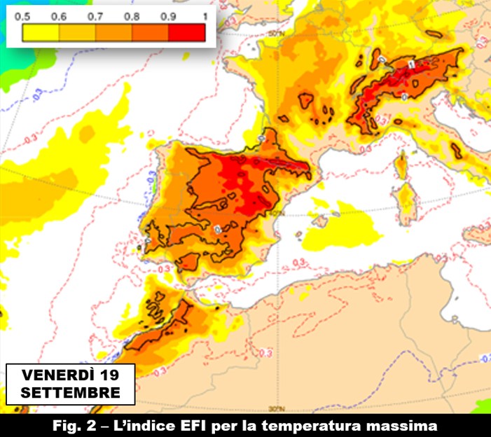 Una situazione che, come avevamo detto nella precedente analisi, potrebbe risultare potenzialmente eccezionale proprio per la portata e l’intensità dell’avvezione subtropicale e le conseguenze che una simile dinamica potrebbe avere sulle temperature massime, il cui Extreme Forecast Index (EFI) previsto tra giovedì 18 e domenica 21 potrebbe superare il valore di 0.8 avvicinandosi all’unità su buona parte della Spagna e, limitatamente all’Italia, sul settore alpino e prealpino a cominciare da quello nord-occidentale (fig. 2): in altre parole, simili valori dell’EFI applicati alla temperatura forniscono informazioni sulla probabilità elevata di avere un campo termico insolitamente anomalo per il periodo e non esclude quindi la possibilità che possano essere raggiunti dei record di caldo proprio su queste aree appena menzionate.