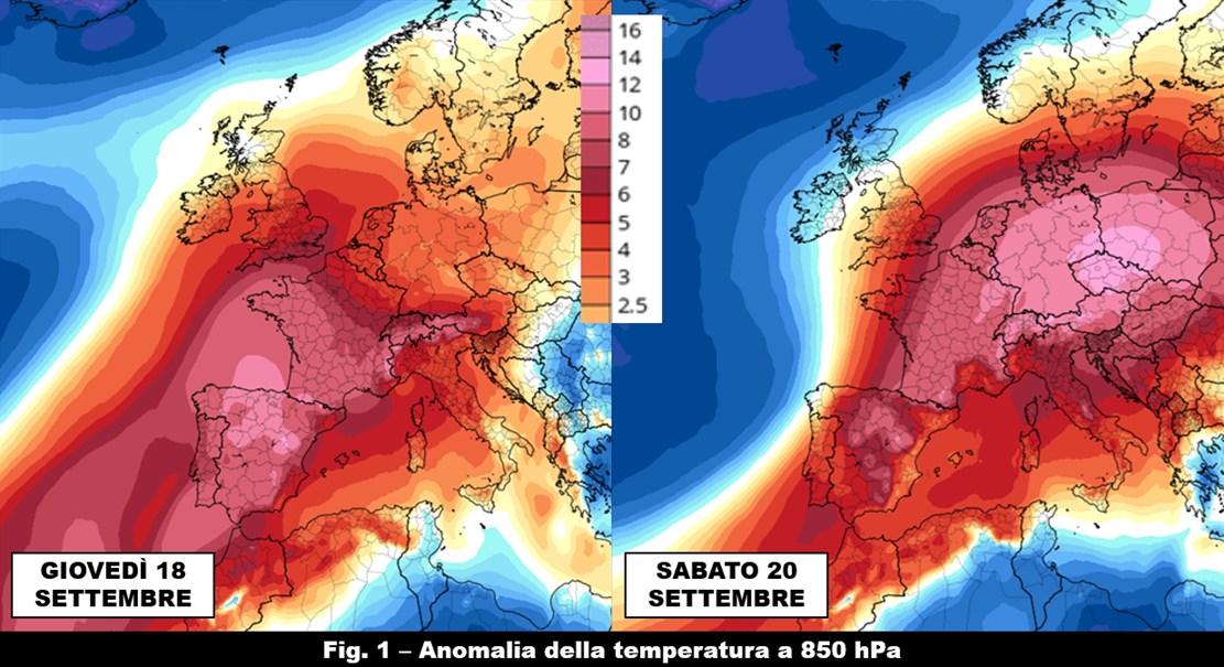 Nella seconda parte di questa settimana si preannuncia una marcata avvezione di aria calda di origine subtropicale marittima che percorrerà tutto il continente europeo, partendo dalla penisola iberica per arrivare fino ai confini occidentali della Russia. Sarà questa la conseguenza dell’affondo di una saccatura nord atlantica che si spingerà fino all’arcipelago delle Azzorre e che, evolvendo lentamente verso levante, andrà a stimolare la risalita del promontorio nord africano verso il Mediterraneo centrale e la maggior parte del nostro continente. In relazione al periodo ormai prossimo alla terza decade del mese, la massa d’aria in arrivo sarà davvero molto calda tanto che la sua temperatura a 850 hPa, cioè a circa 1500 metri di quota, presenterà uno scarto dalla climatologia del periodo per lo più compreso tra 8 e 12 °C con i settori alpino e prealpino italiano maggiormente esposti ai massimi di anomalia positiva rispetto al resto della nostra penisola, dove i valori risulteranno in genere tra i 7 e i 3 °C sopra la media procedendo da Nord a Sud (fig. 1).