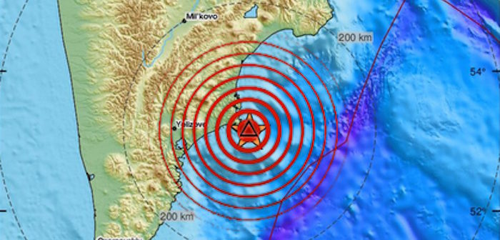 Una fortissima scossa di terremoto di Mw 7.4 è stata registrata dall’USGS alle 04:37:54 ora italiana al largo del Kamchatka, nel Pacifico settentrionale, con ipocentro in mare a 40 km circa di profondità.