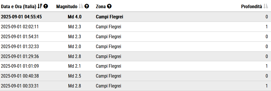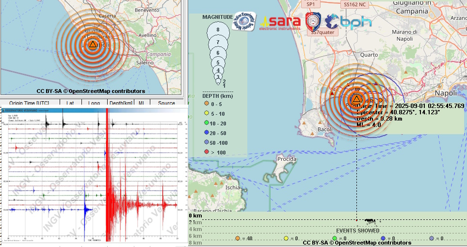 Un terremoto di magnitudo (MD) 4.0 è avvenuto alle ore 04:55:45 ed è stato localizzato nella zona dei Campi Flegrei, nel zona della solfatara di Pozzuoli(NA), in Campania, con ipocentro alla profondità di soli 0,3 km.
