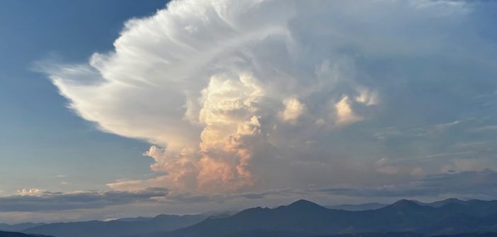 Cominciamo con l’immaginare questa nube, magari una bella NUBE TEMPORALESCA, bella grossa come quella che si vede nella foto. Immaginiamo di calcolare il peso solo di quella singola cella temporalesca a partire dalle sue dimensioni: si tratta di un bel temporale, di forma circolare, esteso per un diametro di 40 km. Un bel temporale, quindi.