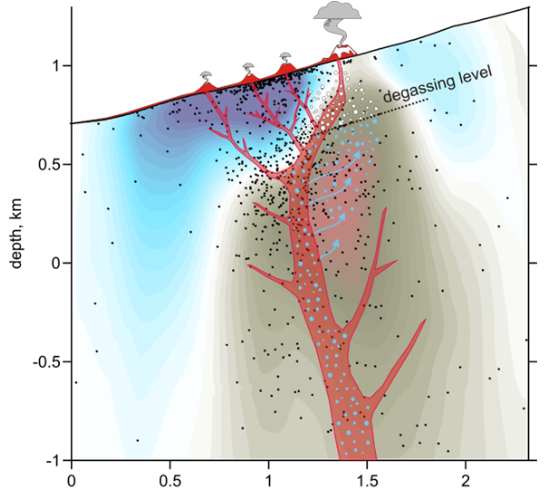 L’indagine è stata resa possibile grazie all’utilizzo della tomografia sismica dei terremoti locali che ha permesso di ricostruire un’immagine tridimensionale dei primi 1500 metri al di sotto del vulcano, attraverso le registrazioni di una rete di 17 stazioni sismiche temporanee installate nei dintorni del cono subito dopo l’eruzione.