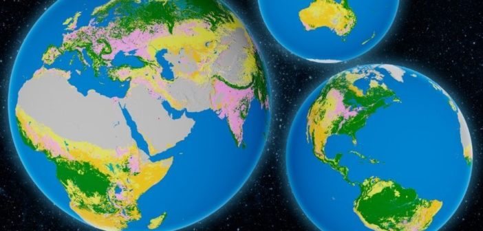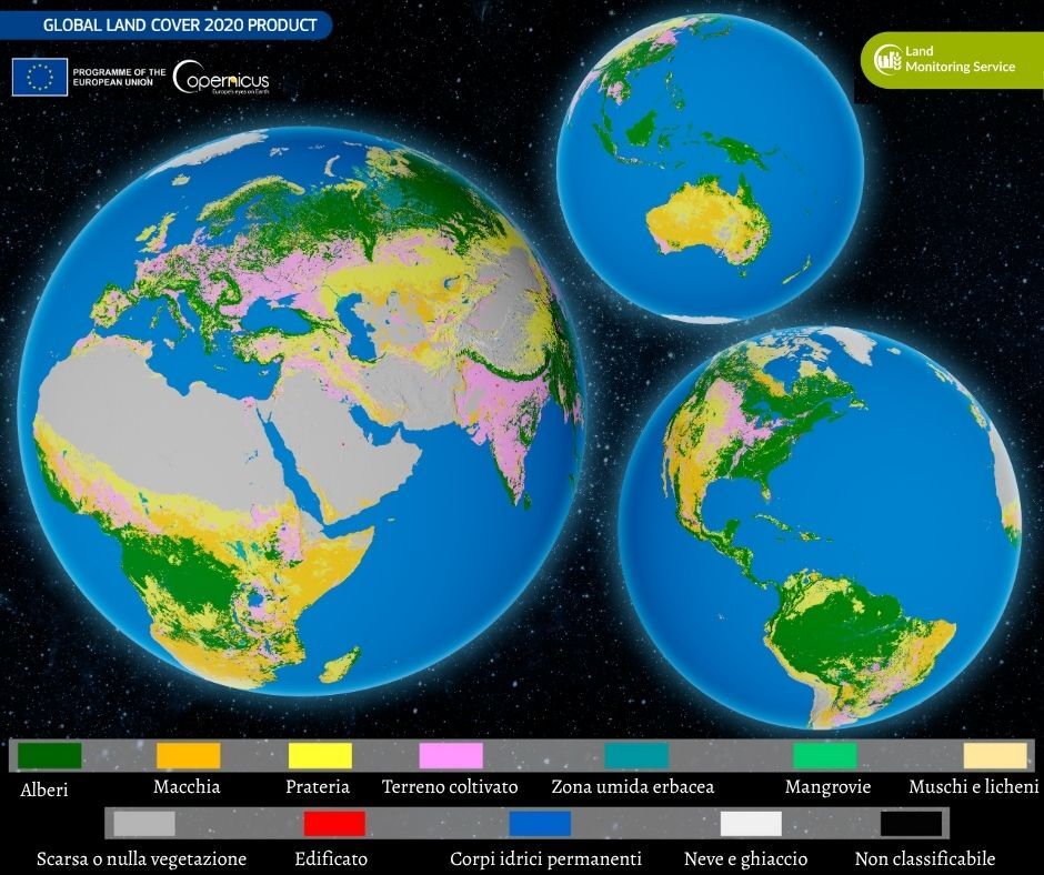 Questa mappa fornisce una visione dettagliata della superficie terrestre per l’anno 2020, con una risoluzione spaziale di 10 metrI. Ogni colore sulla mappa rappresenta un diverso tipo di copertura del suolo, dalle fitte foreste (verde) e terreni coltivati (rosa) alle zone umide (verde petrolio), praterie (giallo) e aree edificate (rosso), indicate nella parte bassa dell’immagine.