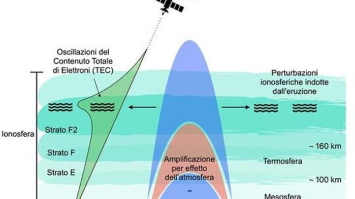Le anomalie osservate hanno mostrato oscillazioni periodiche di 15–25 minuti, con propagazione fino a 200 chilometri a sud-ovest del vulcano: segnali coerenti con le cosiddette “onde di gravità atmosferiche”, ovvero oscillazioni dell’aria che si propagano nell’atmosfera generate dal rapido innalzamento della colonna eruttiva.