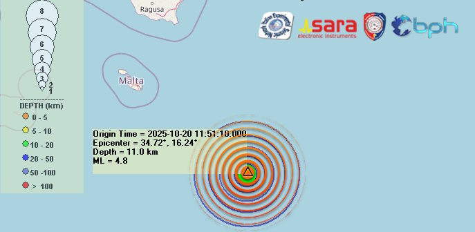 Una scossa di terremoto di magnitudo 4.8 è avvenuta alle ore 13:51:10 italiane con epicentro in mare nella zona di Malta, a sud-est dell’Isola, con ipocentro alla profondità di 11 km.