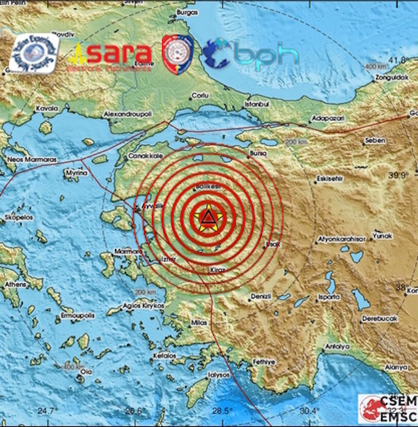 L’epicentro è stato localizzato 4 km a SE of Sındırgı, nella provincia di Balıkesir. Ci sono danni a cose e persone, si temono vittime, evento avvertito dalla popolazione anche in molte località della Turchia