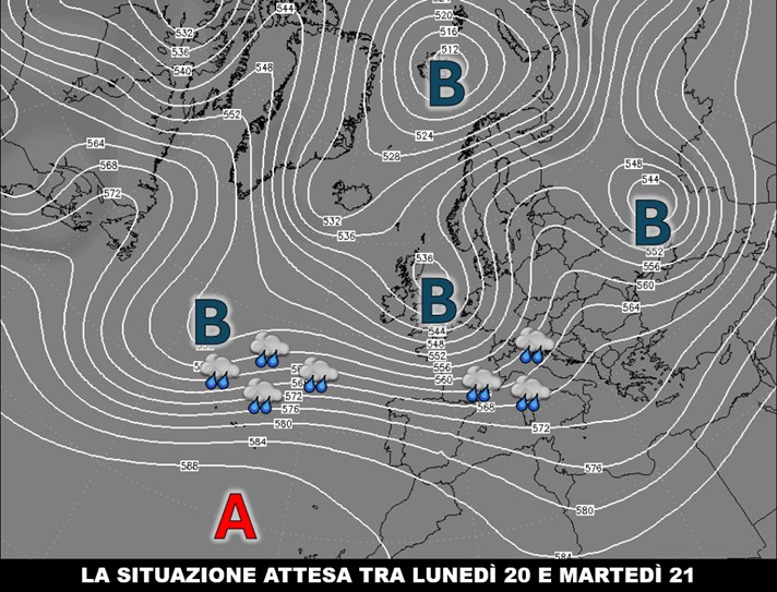 Scusatemi, quindi, per aver dato troppa fiducia a uno scenario che era ancora in corso di aggiustamenti. Detto questo, torniamo al dominio anticiclonico sull’Europa occidentale che avrà modo di resistere fino a sabato. La struttura di blocco sarà infatti erosa dalla circolazione perturbata atlantica, sotto la spinta di una nuova depressione in uscita dal Canada e in movimento verso levante: questa dinamica imprimerà quella forza che sarà necessaria all’attuale figura di bassa pressione, confinata dal blocco anticiclonico ad ovest delle Isole Britanniche, di muoversi verso levante per rimpiazzare proprio il campo di alta pressione.