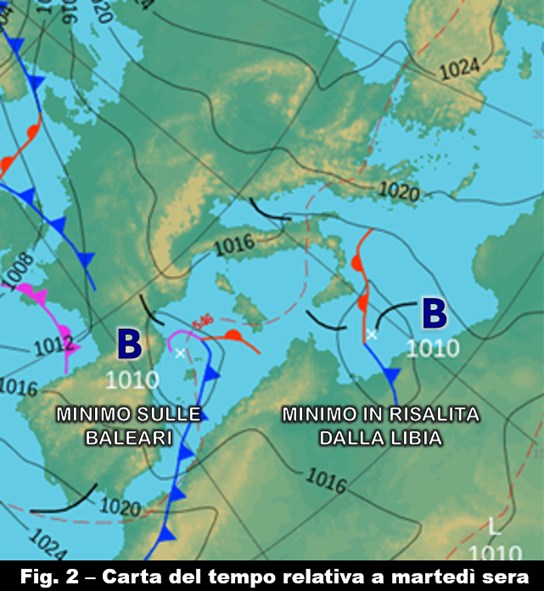 Affondando probabilmente fin sull’entroterra algerino, la saccatura che accompagnerà questo secondo impulso dovrebbe però incentivare anche la risalita di un minimo dalla Libia verso le nostre regioni meridionali (fig. 2): bisognerà quindi valutare come gli effetti dei due sistemi andranno a condizionare l’evoluzione del tempo soprattutto nelle giornate di mercoledì 3 e di giovedì 4 dicembre.