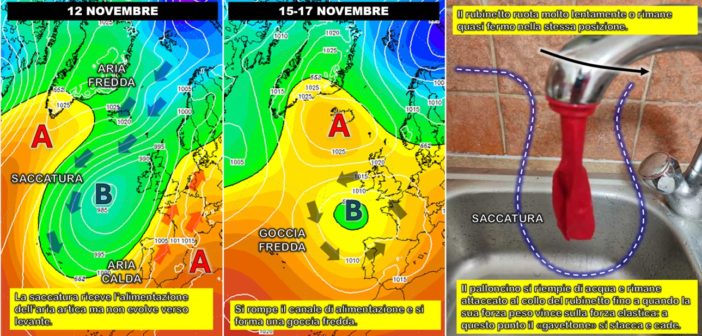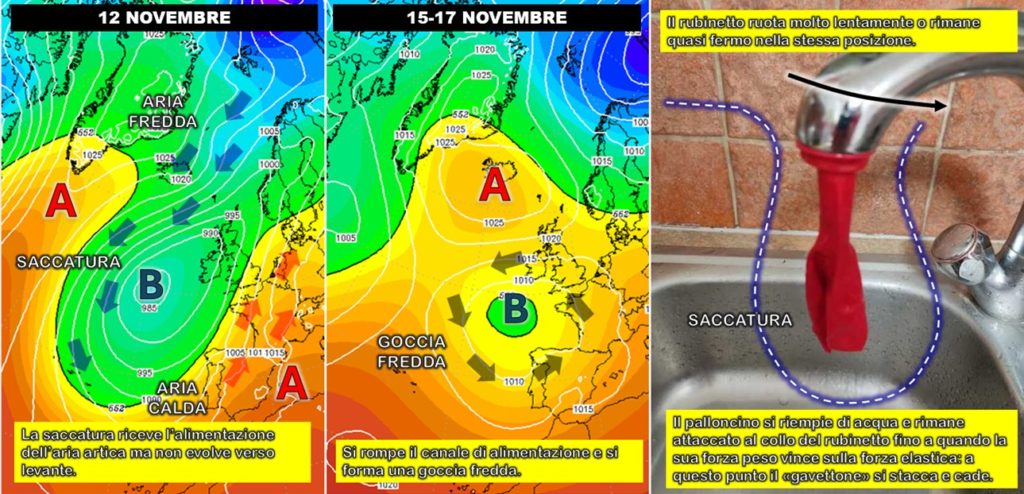 Ecco, è questo il problema generale di fondo che ormai si riscontra con una certa regolarità: la difficoltà del flusso occidentale nel regolare le evoluzioni del tempo rendendole meno ingessate. In modo molto semplificato, tutto funziona come quando attacchiamo al collo di un rubinetto un palloncino per riempirlo di acqua. Se il rubinetto non ruota e rimane sopra lo stesso lavabo, il gavettone-saccatura rimane fermo nella stessa posizione fino a quando la forza peso dell’acqua in esso contenuta diventa superiore alla forza impressa dall’elastico che lo fissa al rubinetto. Quando la forza peso vince, il «gavettone» si stacca, cade e all’altro lavabo non può che arrivare solo qualche schizzo, cioè l’azione periferica di un flusso perturbato che mantiene la propria azione organizzata più a ovest.
