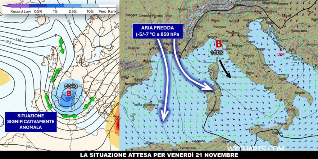 Nelle ultime analisi abbiamo seguito, ricalcolo dopo ricalcolo, la posizione della depressione che è prevista formarsi sul nostro bacino del Mediterraneo tra giovedì e venerdì. Una situazione che andrà sviluppandosi in seno alla discesa di una saccatura ricolma di aria artica marittima che porterà il proprio minimo in quota tra le Alpi Occidentali, il Golfo del Leone e il Golfo Ligure entro le prossime 48-72 ore e che estenderà la propria fin sull’entroterra nord africano. La superficie isobarica di 500 hPa si posizionerà a quote decisamente basse per il periodo, raggiungendo all’incirca i 5300 metri proprio laddove la depressione in quota si accompagnerà al nucleo più freddo della massa d’aria che presenterà una temperatura, sempre a 500 hPa, tra -34 e -36 °C proprio allo sbocco della Valle del Rodano: secondo la climatologia, si tratterebbe di una situazione decisamente fredda per il periodo, tanto che l’anomalia è prevista scendere anche al di sotto del secondo percentile.