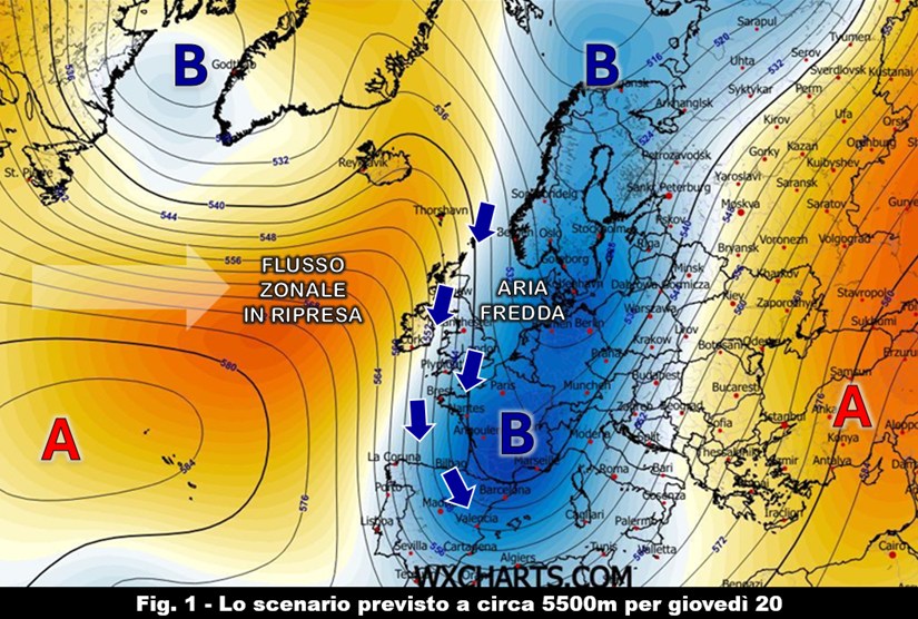 Con l’aggiornamento odierno entriamo un po’ più nei dettagli sull’evoluzione del tempo che andrà profilandosi nel corso della prossima settimana, quando l’Europa centro-settentrionale sarà gradualmente interessata in due riprese da una circolazione fredda di stampo prettamente invernale. Come abbiamo già anticipato nel precedente intervento, questa evoluzione sarà impostata da una incisiva saccatura di origine artica che nei prossimi giorni si espanderà verso le basse latitudini fino ad entrare sul bacino occidentale del Mediterraneo tra mercoledì 19 e giovedì 20 (fig. 1). La conca depressionaria sarà molto ampia dal momento che è prevista affondare fin sull’entroterra algerino ma, allo stesso tempo, sarà incalzata da ovest da una ripresa del flusso zonale che taglierà il contatto con la depressione scandinava riducendo così, entro le successive 48-72 ore, l’apporto di aria fredda in arrivo dalle alte latitudini.