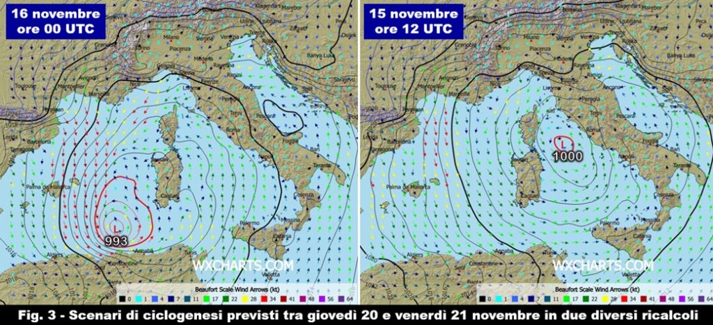 Resta ora da vedere la posizione, l’intensità e l’evoluzione della figura di bassa pressione in probabile formazione tra giovedì e venerdì: emergono infatti ancora discrepanze nei ricalcoli, a dimostrazione di quanto sia difficile inquadrare uno scenario così dinamico su un territorio così complesso come il nostro. Per rendere l’idea, vi propongo due scenari deterministici provenienti da due diversi ricalcoli (fig. 3): nell’ultimo disponibile – riferito a oggi, ore 00 UTC – si evidenzierebbe un minimo di 993 hPa nei pressi delle coste algerine in evoluzione verso nord-est mentre in quello di ieri (sabato 15, ore 12 UTC) la ciclogenesi avverrebbe in prossimità della Sardegna e il minimo raggiungerebbe il Tirreno con una pressione di 1000 hPa per poi continuare a muoversi sempre verso nord-est, attenuandosi. Seguiranno sicuramente altre ipotesi nel corso dei prossimi aggiornamenti fino ad arrivare a uno scenario più affidabile tra martedì e mercoledì: si potrà così avere anche un quadro più affidabile sulla distribuzione delle precipitazioni e, dall’interazione di queste ultime con l’entità di aria fredda affluita, sulla quota delle nevicate sugli Appennini e sull’arco alpino: in questo ultimo caso, molto dipenderà da quanto la depressione riuscirà a risalire verso nord e a impegnare nei fenomeni le regioni settentrionali.