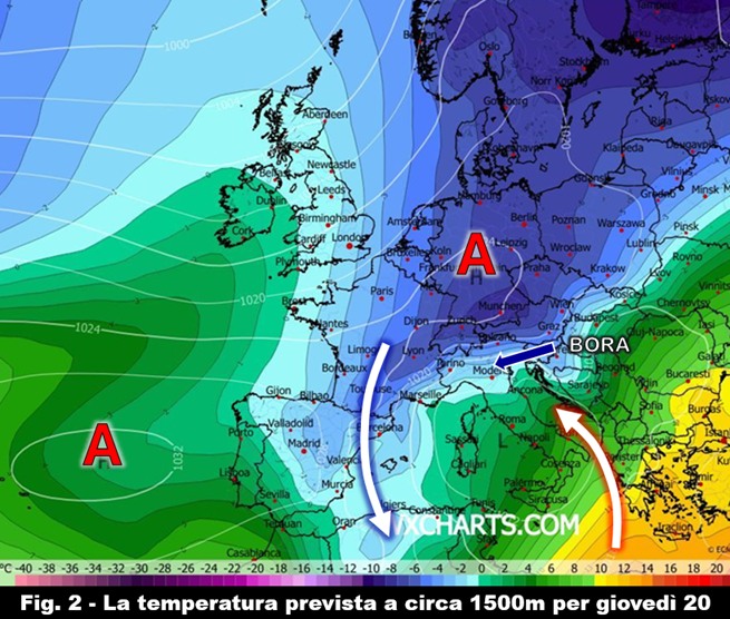 Per via del probabile taglio all’alimentazione artica, l’irruzione di aria fredda non riuscirebbe a interessare tutta la penisola in modo omogeneo e, a seguito della probabile ciclogenesi sui nostri mari, potrebbe limitarsi a farsi strada con i venti di bora soprattutto sulle nostre regioni settentrionali e in forma meno incisiva proseguendo verso sud-est pur andando comunque a causare un calo delle temperature su tutte le nostre regioni.